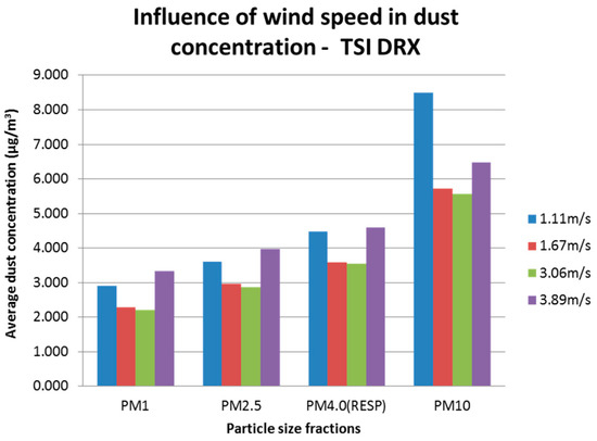 For the TSI DRX, the concentration for different particle size fractions was analysed. Particle fractions considered for the analysis were: PM1.0, PM2.5, PM4.0 (respirable according to ISO 12103-1, A1), and PM10. Figure 12 shows the averaged raw concentration per wind speed used. It is observed that the greatest difference between readings of a particle size with different wind speeds is produced by PM1.0 and PM10 fractions with values approximately 50.0% greater than the minimum average reading. Lower average concentrations were constant for wind speeds of 1.67 m/s and 3.89 m/s, and greater for wind speeds of 1.11 m/s and 3.89 m/s. These constant patterns observed in the different particle size fractions, produced a better outcome when generating the models.