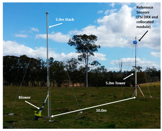A variable quantity of calcined alumina was blown out of the stack at approximately 30 s intervals. The total weight of powder expelled per interval was measured using an electronic balance (ELB600, Shimadzu, Kyoto, Japan). In-situ meteorological data was collected with an Oregon Scientific WMR200 weather station placed at the test site. Status and readings from the two modular sensors were followed via the radio link and controlled using SSH connection. In order to use the data produced by all the monitoring devices (dust monitoring modules, TSI DRX, and meteorological station) it was necessary to synchronise their datasets by programming the weather station and the TSI DRX. However, the dust monitoring modules had to be adjusted by internet clock link using WiFi and a portable hot-spot connection.