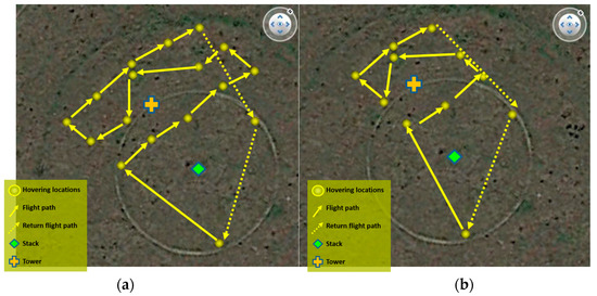 In Alvarado et al. (2015), a circular flight pattern was used to scan the area and create a grid to characterize the dust plume. However, for this flight test a different grid was designed for this test due to the small size of the plume and the endurance of the UAV, which was of approximately 10 min. Two grids were designed for the first two tests. The grids were oriented northwest, downwind from the stack (source), and followed a zig-zag path around the monitoring tower (Figure 14).