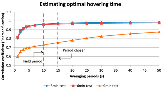 For Test 1 the multi-rotor UAV was programmed to follow a predetermined path using the “Tower” mobile application from 3DR, hovering at waypoints for 15 s. The pattern was repeated at heights of 7.0 m and 9.0 m covering an area of 225.0 m2 approximately. The hovering periods were estimated on 15 s lapses according to the analysis of data produced in the laboratory during the calibration tests. This was estimated by averaging concentrations at different time periods and obtaining their correlation (linear association) using the Pearson product-moment correlation coefficient (r). Making a plot of the coefficients, it was possible to choose a time period that could reduce noise in the readings produced by the OPC-N2, and also allowed enough readings to be collected during the 10 min flights (Figure 15).