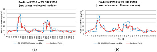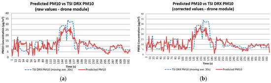 Comparison between PM10 concentration readings obtained with the TSI DRX and the predicted values calculated for Test 2 using the models generated with (a) raw values; and (b) corrected data.