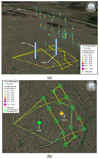The lowest errors produced when comparing calculated emission rates from the airborne module and the field values, were produced by Test 1 and Test 4. These results indicate that by hovering for short periods of time (10 s to 15 s) it is possible to produce estimations very close to the field values. Another advantage of hovering for short periods of time is that the battery can be used more efficiently, and more hovering locations can be covered within its flying endurance. Having the UAV hovering close to the devices in the tower can assist in concluding that the concentrations corrected with the model developed in the laboratory and the field values were comparable, with a low error between them.