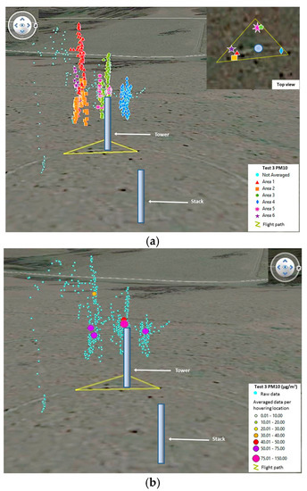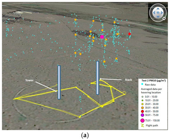 With Q being the emission rate in µg/s, C is the concentration in µg/m3, σy and σz the dispersion factors for a puff emission, and U the wind speed in m/s. A Gaussian model was used for this investigation due to its simplicity and extensive use for different modeling scenarios [21,22,23]. Background levels were estimated by reviewing the data from all flight tests and checking the minimum concentrations registered, which ranged from 0.0 µm/m3 to 5.6 µm/m3.