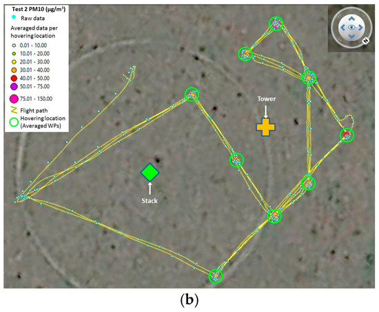 An experiment was designed to collect experimental data similar to that obtained at open pit mine sites from activities such as hauling, stockpiling, blasting, etc. These activities are area sources or fugitive emissions, however to create an experimental site in which variables could be easily monitored and controlled, a stack emission was the most feasible option. The experiment consisted of using a 5.0 m stack (5.0 cm diameter), through which calcined alumina was supplied and expelled with the use of an electric leaf blower. Due to the dimensions of the stack, it was not possible to sample PM10 concentration readings from inside the stack isokinetically. However, this contributed in making the scenario similar to a real fugitive emission, measuring directly with the multi-rotor UAV from the plume generated. A 5.0 m tall “monitoring tower” was installed at a distance of 10.0 m downwind from the stack. At the top of the tower, a TSI DRX and a duplicate of the dust monitoring module were installed. This tower was used to compare dust concentration readings from stationary devices against airborne data (Figure 13).
