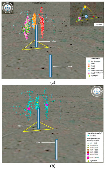 It was expected that a moving average of 15 s or 10 s would produce a better correlation for Test 1 and Test 2 respectively, as these were the hovering sampling periods for which they were programmed. However, it was observed that only Test 2, with the airborne module, produced a reasonable correlation. This could be due to the influence of other environmental variables such as wind speed, wind direction, dust supply rate, etc. For both Tests 1 and 2, the raw values of the airborne module presented the higher errors in the calculation of emission rates. This indicated that the correction made to the readings with the model developed in the laboratory does increase the correlation between the real value and the value obtained with the airborne module. Lower percentage errors resulted when correcting the values calculated with the airborne module with Equations (1) and (2), due to an overestimation observed in all values once processed, when compared with the values of the TSI DRX.