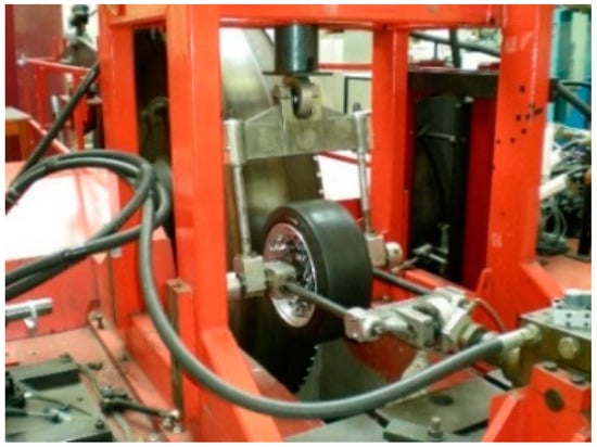 First of all, it is important to show the strain gauges’ position. There are three multiaxial strain gauges, two of them in the same cross section and the third one separated by 123.75 of angular rotation, as shown in Figure 3. Figure 3 also shows the support installation of the rectangular rosette strain sensors on the inner surface of the tire. It was made using a manufacturer recommended adhesive for rubber materials.