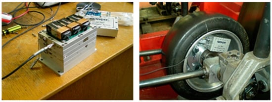 For the experiments, the DUNLOP SP SPORT 175/505 R13 (tubeless) slick radial tire was selected. This type of tire, which normally operates at low vertical loads and inflation pressures, is used for the Formula SAE. The speed used in this work was limited at 50 km/h, which is suitable for the sampling frequency used. In addition, the average speed in the circuits of the Formula Student is usually under that speed. The working range of the SoMat® 2000 strain gauge module used was between −5000 and 5000 με.