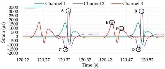 The variation in the strain data collected may also be useful information to identify the variation of tire working conditions. Since these strains are generated due to the corresponding efforts, especially those which occur in the tire-road contact patch, their characteristics have provided a significant role in the estimation of tire dynamic behavior, tire tread wear and other characteristics [25]. For instance, tensile strain peaks E and F (see Figure 5) change when the tire is involved in a braking/traction process [26,27]. In this aspect, the experimental data show promising results. They confirm that the tensile strain peak E increases while F decreases when tire is braking, and vice versa for tire traction. However, this part of the study is currently being developed and requires a specific analysis.