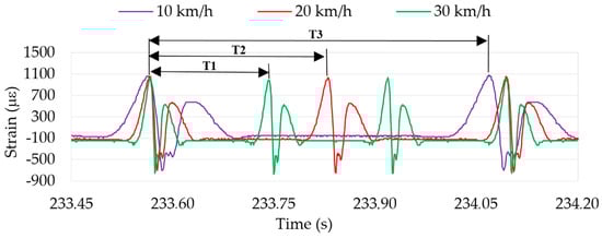 The first experiments were carried out varying speeds with different vertical loads and inflation pressures. Deformation curves at 10, 20 and 30 km/h from the first maximum tensile strain point have been overlaid in Figure 7. It shows not only that, as might be expected, the wheel period decreases as speed increases, but also the difference in the curve width (i.e., the contact patch length) due to the time the strain sensor spent in passing through the contact patch, in other words, the width between two consecutive maximum tensile strain points, approximately.