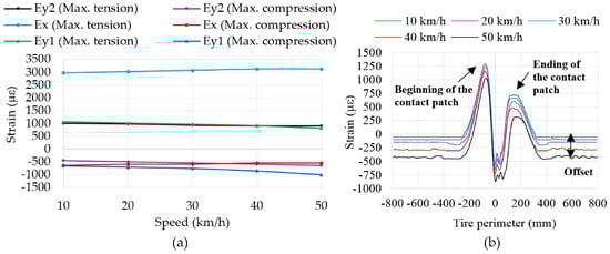Thus, it is verified that there are significant changes in strain values due to speed increments. It is also noted that when the sensor is away from the contact patch (i.e., the intervals (−800, −300) mm and (400, 800) mm, Figure 8b), strain sensors keep providing useful information about strain, particularly in compression, whose values increase as speed increases, due to the centrifugal force.