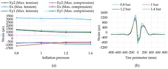Tensile strain values decrease for the three channels, while the maximum compressive strain value only decreases in εx, therefore, the amplitude in longitudinal direction (εx) decreases when the pressure increases (see Figure 9a). Curves at different pressures for εy1 have been overlaid in Figure 9b. Note that there exists a direct proportional relation between the pressure increment and the increment in maximum compressive strain values due to the increment in the stiffness of the tire. As is well known, at low pressures the tire leans more on the shoulder of the tire than the central part of the tread, while if the pressure is high the tire leans excessively on the central part thereof. Thus, when the shape of the contact patch varies, changes in strain values in the central part of the contact patch (around to 0 mm) occur.