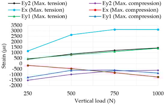 With the aim of developing the intelligent tire, it is especially interesting to observe from Figure 10 that tensile strain values increase linearly in the case of εy. Thus, in order to measure changes in vertical load, it would be recommended to use sensors disposed laterally. Finally, Figure 10 shows that information provided by εy1 and εy2 is equivalent. Figure 11a,b shows curves for different vertical loads for εx and εy1, respectively.