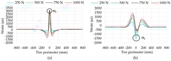 Within the contact patch area, around the tire contact patch center (0 mm), fluctuations for εx strains (point O1 in Figure 11a) do not occur, contrary to εy1 (point O2 in Figure 11b). For low pressures and loads, there is a slighter contact between the road and the 0 mm point (center of the contact patch).