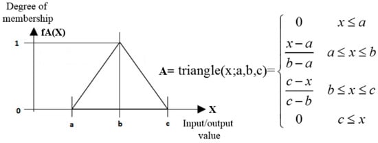 In order to understand how it works, let’s assume X (the horizontal axis in Figure 13, either input or output values) is a space of points and the generic element of X is denoted by x (X = {x}) (see Figure 13). A membership function fA(x) characterizes a fuzzy set of A in X in which each point in X is a real number in the [0, 1] interval and the values of fA(x) at x represent the degree of membership of x in A. If the value of fA(x) is closer to 1, it means x has a higher degree of membership in A. Finally, indicates the membership function of x. For simplicity, this study used triangular membership functions. The distribution can be mathematically expressed as shown in Figure 13.