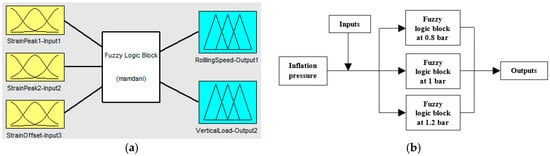 Finally, despite the fact that inflation pressure (P) could be a variable to be determined based on strain data, it is not a variable which estimation implies today is an obstacle, since it is correctly measured by TPMS, so in this simulation work it has been taken as a known parameter, so that three fuzzy logic blocks have been developed for 0.8, 1 and 1.2 bar, since 1 bar is considered the nominal pressure of the tire used in this work. In this way, as inflation pressure does not change from instant to instant (unless a puncture happens), once it has been measured, the corresponding fuzzy logic block can be used (see Figure 14b).