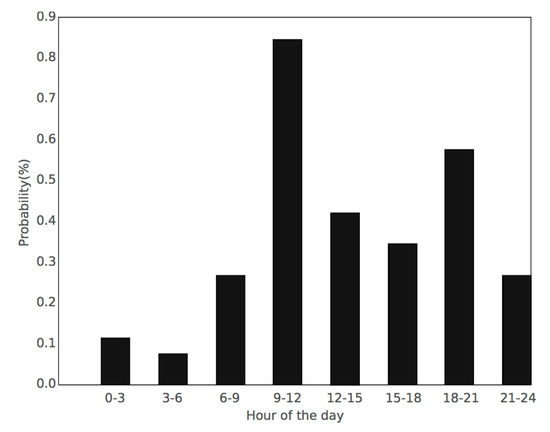 Regarding the basic belief functions (BBAs), they are modeled as follows. For every appliance, a BBA is obtained taking into account the day of the week and the time interval of the day. It has been empirically proved that the appliance usage patterns not only vary during hours of the day, but it also does in a significant way depending on the day of the week. Likewise, during the training process, the occurrences for each appliance are binned by the time interval and the day of the week. The number of occurrences in each bin for a certain day of the week is divided into the total number of that specific day of the week in the training set. This denotes the probability of the appliance to be used at that time of the day for that day of the week. Following this process, similar BBAs to those in Figure 1 are obtained, where the time interval was fixed to three hours. Note, for instance, that here the probability , where is the time interval of the day when using the kettle between 9 h and 12 h, is roughly 0.85. Additionally, there is another time interval with high probability of using the kettle between 18 h and 21 h (0.6 approximately). During the test, BBAs are based on this probability, so they are weighed depending on the presence or absence of events within the considered interval as in Equations (11)–(13). Thus, the constant represents a certainty on the probability for an arrival event, whereas the constant shows the certainty in absence of event. The value of these two constants ranges from 0 to 1, and they depend on the application. More details about the certainty constants is discussed in Section 3. In order to meet the requirements in Equations (1)–(3), the mass should be defined as in Equation (12) to hold the uncertainty produced by and in Equations (10) and (11).