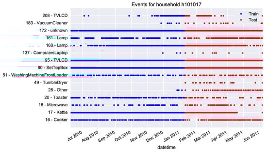 The approach presented here is based on the employment of a NILM algorithm and, therefore, only the disaggregated data from datasets are used. Presenting a new NILM algorithm for disaggregation is not the topic of this study and it has been fully studied in previous works already mentioned in Section 1. In this way, the relevant events are extracted from the appliance-level consumption. Relevant events are those whose evaluation can result in the inferring of any human activity inside the household. Consequently, only manually activated appliances with a repetitive pattern over time are considered here, discarding appliances such as the fridge with a continuous and automatic consumption. The relevant events are the recorded timestamp of switching-on for these appliances. Although, the time duration of appliance usages is also a good indication about the routines, this implies a more complex pattern to infer the real human activity, as they could be overlapped. Furthermore, the duration does not really imply any human activity as the appliance could have been left on. Nevertheless, switching-on events do require human activity. For instance, Figure 2 shows the switching-on events in household No. 101017 from the HES dataset over time. Each spot is an event and the y-axis represents the appliance code, where non-relevant appliances have been already filtered out. The first 60% of total days are used for training, whereas the remaining 40% is for testing. It is worth noting that some deviation from the routine over time is expected. This is why the model should be trained with earlier days than those used for test, in order to learn the starting normal routine. As can be observed in Figure 2, if the ratio between training and test samples is less than 60%, then some appliances do not have enough samples for training.