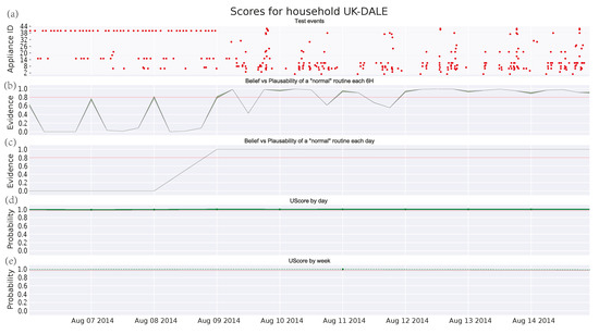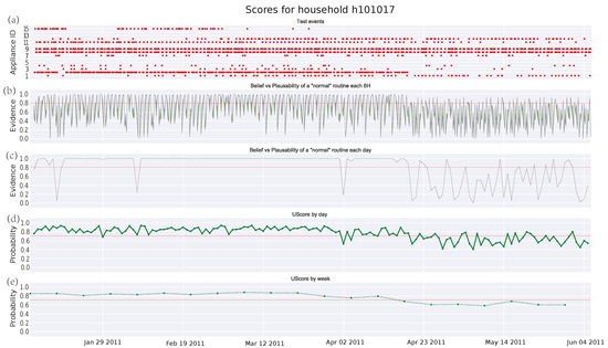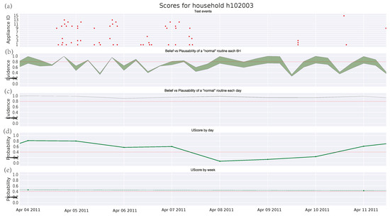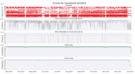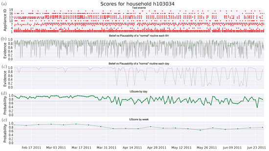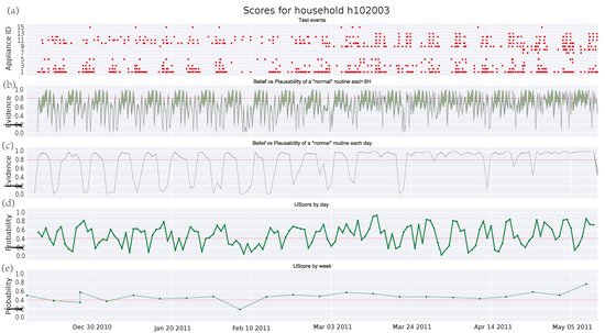 Finally, a case of a family with two adults, two children, and a dog is analyzed in Figure 7. Firstly, it is worth noting the increasing number of events coming from different (manually operated) appliances. Furthermore, the scores provided by Figure 7c–e reflect a very strict routine. This routine does not deteriorate over time and only shows abnormal intervals that may correspond with holidays or absences in the house. However, these deviations remain undetected by the GMM algorithm. Regarding the threshold, this can be easily set for the DST algorithm, whereas it becomes more difficult for the GMM one. Anyway, it should be close to 1 in order to detect some anomalies.