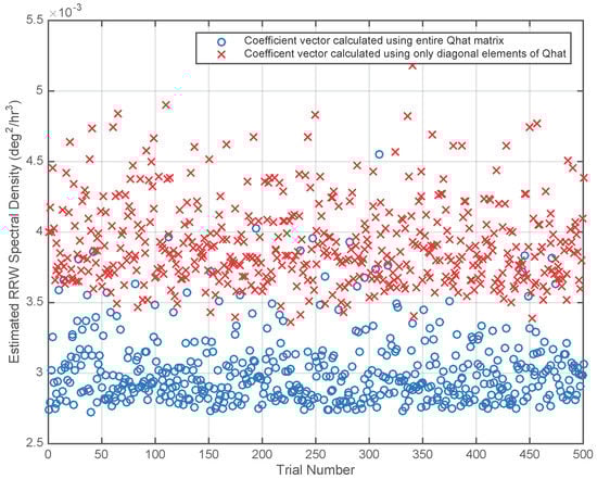Random drift (RRW) spectral density for virtual gyros corresponding to coefficient vectors calculated using only the diagonal elements of and using the entire matrix. A virtual gyro created by averaging the gyro signals has an RRW spectral density of for all trials (see Table 1).