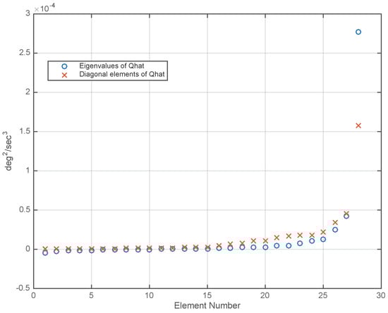 The sorted eigenvalues of and the sorted diagonal elements of are plotted in Figure 2. The differences in the elements of these two lists indicates correlation between the RRW components of the gyros, which can be used for drift reduction.