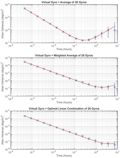Allan variance plots for virtual gyros. Circles are calculated Allan variance points. Smooth curves are theoretical Allan variance plots corresponding to the obtained for each virtual gyro using Algorithm 1. Vertical lines through each point are standard deviations calculated using . (Top plot): average of 28 gyros. (Middle plot): weighted average of 28 gyros using only diagonal elements of . (Lower plot): optimal linear combination of 28 gyros.