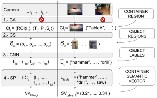 The Passive Learning Sensor Architecture is designed to work in indoor environments, passively acquiring relatively low resolution images where the objects to detect are seen from a far distance. It detects possible object locations through multimodal information, combining semantic language data with image information. The architecture consists of a processing pipeline of four main steps, as illustrated in Figure 2. The first step, Cognitive Attention (CA), selects images that show a container with pontential objects in it. From these images, it extracts Regions of Interest (ROI), i.e., square parts of the image, where an object container is seen. The second one, called Cognitive Subtraction (CS), performs a segmentation of this ROI using the internal world model. This process extracts, within the regions selected during the first step, those regions potentially corresponding to known or unknown objects lying in the object containers. Afterwards, a Convolutional Neural Network (CNN) step sets labels according to the possible classes (i.e., object types) for the image regions obtained in the previous step. Finally, a Semantic Processing (SP) step uses a learned semantic model to improve the labels from the CNN and maximize the probability of finding the correct container for the object searched. After processing the images, it produces average semantic descriptors for each container found that will help in the later object search task. This section details the different stages of the pipeline of the sensor architecture. We use the case of a social robot looking for a mug to better explain the work flow of the architecture.