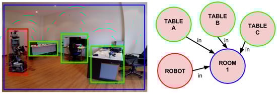 The cognitive model used in this implementation of the PLSA is Active Grammar-based Modeling (AGM) [16]. AGM cognitive models are multi-graphs where nodes and edges are typed and can be attributed with metric properties. The type of a node is used to denote the kind of entity it represents, whereas the type of an edge denotes the kind of relationship among the linked symbols. Metric properties can also be included in the nodes and in special edges designed to this end. The metric properties of nodes and edges allow to automatically generate a geometric model of the environment from the cognitive model. Additionally, these geometric models can be easily used to perform collision checks, to estimate relative poses and camera projections, and other operations. An AGM world model that contains the robot, rooms and tables is shown in Figure 3. However, other alternatives to this cognitive model can also be used (e.g., [17,18]) as long as they allow storing and accessing the necessary information, and support the computation of the contour of the containers in the images. Given the cognitive model, once an image is considered to have a container, the contour of that container is projected from 3D to the 2D space of the camera image. If at least of the of the container lies within the image, then that region is selected and the next stage of the PLSA is triggered, otherwise the image is ignored.