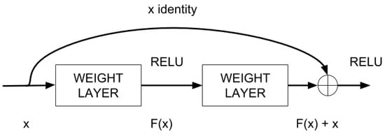 The other advantage of this setup is that such connections help to handle the vanishing gradient problem in very deep networks, which slows down the training of front layers. This is defined formally in Equation (4); being x and y the input and output vectors respectively and having as the residual mapping to be learned. For the example in Figure 5 that has two layers, in which σ denotes the rectifier linear unit (RELU) [23].
