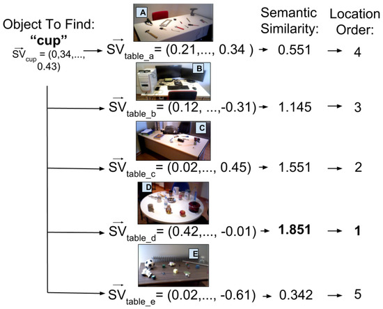 Once the user of the system wants to find an object with label , the semantic vector representation of the label is computed using the learned skip-gram model. Afterwards, the Semantic Similarity to each container c is calculated as the cosine distance (dot product) of the representation of the label and the semantic vector of the container (see Equation (5)). The higher the value obtained, the better result and the closer, semantically, the object searched is to an object container.