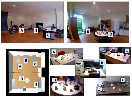 Figure 8 shows the environment in which the experiments took place. Five different object containers (tables in this case) are distributed among two rooms of an apartment, with five different types of objects on them. The disposal of the objects follows the principle that, in indoor environments, those with similar purposes are usually found in the same places. The tables in the apartment are configured for the experiments as follows (labeled as shown in Figure 8): table A contains hardware tools, table B has a computer and other tech gadgets, table C has office supplies, table D has kitchen utensils, table E contains different toys. It is worth noting that some of the objects are often labeled differently depending on the person asked (e.g., some people would label an object as a “toy” while others would call it a “plush”). Therefore, asking the robot about the location of an object using a particular label requires the system to be able to generalize.