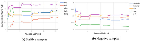 These graphs show how the semantic similarity between objects and the SV of table A evolves as more images of table A are added to the buffer of the PLSA. The higher the Semantic Similarity value is, the higher the likelihood of the presence of the object. (a) objects queried are present in the table; (b) objects queried are not present in the table.