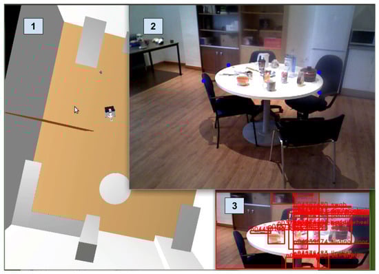 Shelly, a humanoid social robot, exploring an apartment and labeling objects on tables. The visualization of the labeling process is shown in the top right corner.