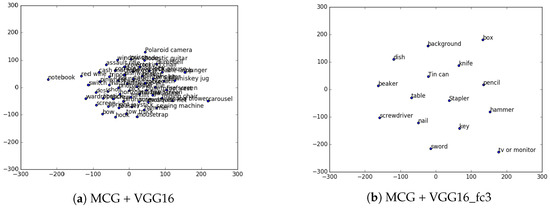 For a better visualization of this issue, t-SNE [33] was used. It is a dimensionality reduction technique well suited for the visualization of high-dimensional datasets. Using this technique, Figure 11 shows a plot of the vector representations of labels obtained for table A, when using a generic training (Figure 11a) and when using a fine-tuned one (Figure 11b). Since generic trainings have more classes, sometimes they generate light fails. A light fail is a name used to denote failure made with a word that is not very far in meaning to the correct one (e.g., mug instead of cup). This light fails to help maintain the of the container around the similar space, almost as if it were a correct answer, therefore not considerably affecting the final result. However, when using the models retrained with a reduced set of classes, and probably influenced by the lack of vocabulary available in their results, the fails are usually not so light. This means that a fail, more often than with the big ImageNet generic trained models, will be a totally different word (e.g., screwdriver instead of cup). This makes the location in the search space of the of a container very affected by the fails of these models, which makes it have a lower semantic similarity (a higher distance to the words in the search space) to the actual correct labels of the objects it contains, lowering its general success rate. Therefore, it can be concluded that generic training datasets with a larger number of classes are more likely to benefit from the semantic processing step of the PLSA.