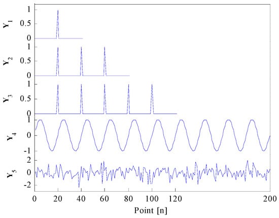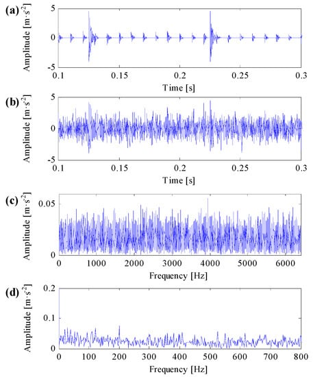 where the rolling bearing simulation signal includes impulse series and noise signal . T is the average period of impulse series; is the impulsive feature frequency which equals to the reciprocal of T and set to 100 Hz; is the tiny random fluctuation of the i-th impulse and ; C is the damping coefficient which equals to 900; is the resonant frequency of the simulated rolling bearing system which equals to 4000 Hz; is the vibration amplitude which equals to 1; is additional impulsive noise; D is the damping coefficient of the impulsive noise which equals to 600; is the resonant frequency of the impulsive noise which equals to 2500 Hz; and is the vibration amplitude of the impulsive noise which equals to 5. Two impulse noise components are added to at the moment of and , respectively. The noise signal is white Gaussian noise with noise variation equaling to 1. The sampling frequency of simulation signal is set to 12,800 Hz while the sampling points are set to 6400.