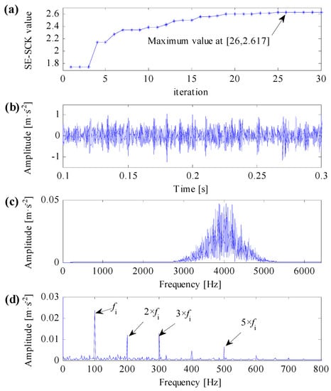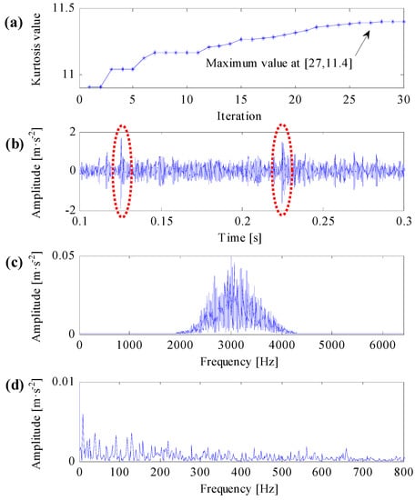 Firstly, utilizing the proposed optimal resonant band demodulation method to analyze the simulation signal, which is shown in Figure 4b. According to the algorithm flow in Figure 3, the impulsive feature frequency equals 100 Hz; the central frequency searching range of the optimal resonant band is set between 50 Hz and 6350 Hz; and the bandwidth searching range of the optimal resonant band is set between 100 Hz and 1000 Hz. By initializing the Particle Swarm Optimization algorithm, the calculation result after 30 times’ interactive computation is shown in Figure 5a, where the maximum of the improved correlated kurtosis occurs at 26th calculation, which equals 2.617, and the acquired optimal center frequency and bandwidth of resonant frequency band are 4015 Hz and 760 Hz, respectively.