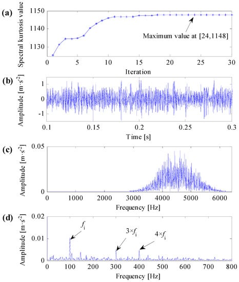 One can learn from Figure 7a that the maximal spectral kurtosis of the squared envelope signal occurs at 24th iterative calculation and the acquired optimal center frequency and bandwidth of resonant band are 4560 Hz and 1000 Hz, respectively. Constructing complex Morlet wavelet filter based on the acquired optimal resonant frequency parameters, the filtered signal is shown in Figure 7b and its frequency spectrum is shown in Figure 7c. From Figure 7c, the filtering central frequency of the optimal complex Morlet filter is not identical to the resonant central frequency of the simulation signal, but the filtering frequency band still can properly cover the resonant central frequency of the simulation signal. Consequently, from Figure 7d, the SES of the filtered signal can extract distinct fault features.