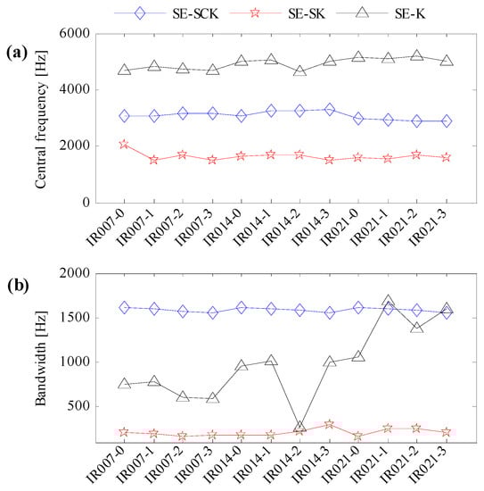 One can learn from Figure 9a,b that for the improved correlated kurtosis, the identified resonant central frequencies are centering around 3000 Hz, and the identified resonant frequency bandwidth is centering around 1600 Hz. For the kurtosis of squared envelope signal, the identified resonant central frequencies are around 5000 Hz, but the identified resonant frequency bandwidth is dispersed. For the spectral kurtosis of squared envelope signal, the identified resonant central frequencies are around 1500 Hz, and the identified resonant frequency bandwidth is around 160 Hz. Data IR007-0, which represents the minimal fault level and minimal motor load, and data IR021-3, which represents the maximal fault level and maximal motor load, are utilized to perform optimal resonant frequency band demodulation to verify the effectiveness of the identified resonant frequency bands in Figure 9.