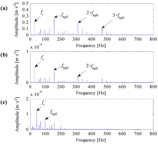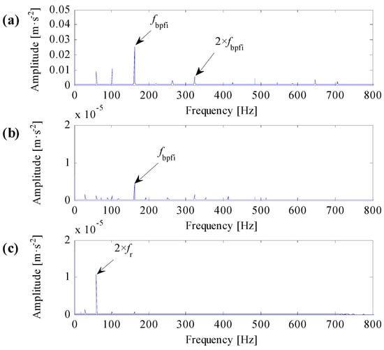 Constructing the complex Morlet wavelet filter based on the optimal resonant frequency band parameters, the filtered simulation signal both in time domain and in frequency domain are shown in Figure 5b,c, respectively. The signal filtered by the optimal complex Morlet filter roughly shows transient impulse feature. The filtering central frequency of the optimal complex Morlet filter is almost identical to the resonant central frequency of the simulation signal, which equals to 4000 Hz, and the filtering frequency range can properly cover the resonant frequency band. The SES of the simulation signal performed by the proposed method is shown in Figure 5d, where the fault feature frequency and its harmonic frequencies are easy to identify. In the meanwhile, fault feature frequencies are dominant in frequency domain. Consequently, the improved correlated kurtosis can conquer the disturbance of impulsive noise, identify the repetitive transient impulse series. Combining complex Morlet filter and PSO optimization algorithm, the proposed optimal resonant band demodulation method can adaptively identify the optimal resonant band and demodulate fault features.