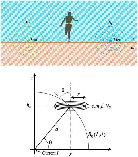 The transmitting unit is composed by a radio frequency (RF) generator and two wires, CTX1 and CTX2, (length of about 400 m and cross section of 2.5 mm2) lying on the ground. Currents I1 and I2 flow along the wires and generate two induction magnetic fields—B1 and B2 respectively—as depicted in Figure 2 (top). The receiving unit is composed of a flat cable of N wires and a small circuit, which detects the two different electromotive forces (e.m.f.) induced by the two magnetic fields and then it evaluates the position of the runner inside the lane (the receiving magnetic loop and the relative signal processing unit will be described in detail in Part II of this paper).