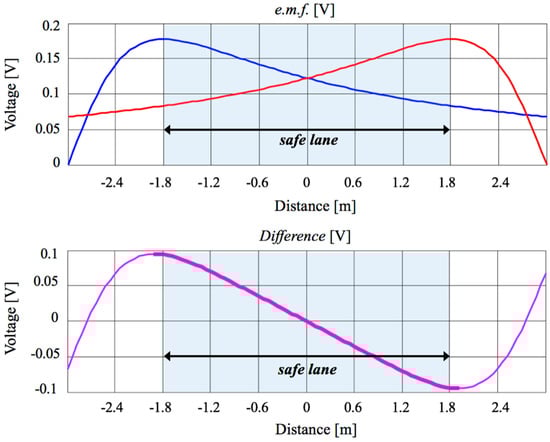 As the detecting coil (placed at a constant height hc) moves from x = 0 (i.e., above the wire) to a higher value, a variation of the induced voltage (Equation (1)) occurs, due to the change of the distance between the wire and loop and to the concatenation angle θ = arctan (hc/x). By repeating the same considerations for the other wire, Figure 3 top is obtained, where the two e.m.f. are depicted for the case of hc = 1 m, I0 = 1 A and f = 100 kHz. The presence of a region between the two wires where both signals are monotone, one is decreasing and the other is increasing, can be clearly seen. Their difference (Figure 3, bottom) highlights a monotone behavior in the central region. This zone of linearity has been chosen to delimit the safe lane and the intensity of the difference signal is used to guide the athlete, modulating the warning message according to his position in the lane.