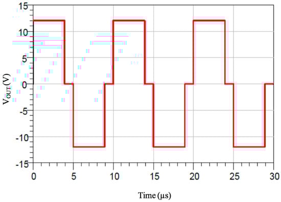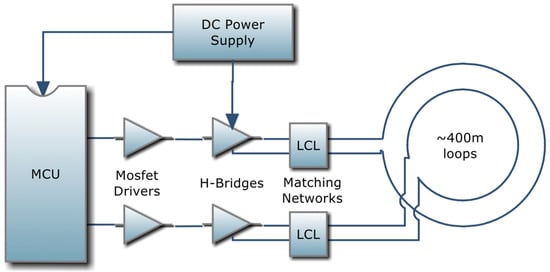 The generation of a square wave at 100 kHz was implemented using a microcontroller unit (MCU). Since, for this function, very few resources (in terms of ROM, RAM and pin count) are needed, the chosen MCU is an Atmel AVR ATtiny44 (4096 bytes of flash memory, 320 bytes of RAM, 256 bytes of Eeprom). The final stage that injects current to the 400 m long loop has been designed as an H-bridge driver to allow both polarities to feed the loop, thus doubling the voltage/current drive, with respect to a single switch drive. Between the MCU pins and each bridge, some current drivers have been used to speed up the charge/discharge of the gates of the Mosfets and to ensure their full conduction. To prevent simultaneous conduction of the Mosfets of the same branch of the bridge, a little dead time has been added during transitions. Therefore, the resulting waveform is a modified square wave, and the voltage at the terminals of the generator is the one depicted in Figure 7 for the case of a supply of 12 Vdc.