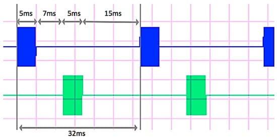 The signal is characterized by a pulse repetition time of 32 ms and a duration of 5 ms (blue trace in Figure 5). The same signal is delivered to the second wire after a delay time of 7 ms (green trace in Figure 5). This sequence defines different delay times between current pulses, so that each new pulse on the first wire is generated 15 ms after each pulse on the second wire is ended. This sequence is detected by the receiving unit through the generated magnetic field and allows to discriminate between signals coming from the two different wires.