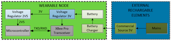 The sensor node includes a novel and compact power supply system similar to those available in smartphones and other portable consumer electronic devices. It consists of a MCP73833 battery charger circuit from Microchip, a rechargeable battery and two low dropout (LDO) regulators to provide the power voltage levels required by the different components. The selected battery is a 3.7 V and 800 mAh Lithium Polymer (LiPo) LP-573442-1S-3 that meets the W-WSN node energy requirements with a small size. The voltage regulators provide stable, well-defined voltage levels from the decreasing battery voltage: an MCP1725 LDO voltage regulator (Microchip Technology Inc., Chandler, AZ, USA) provides a 3 V constant voltage to power the XBee RF transceiver. The second LDO regulator (TC1015 also from Microchip) provides a constant 2.5 V level to power the rest of node electronics.