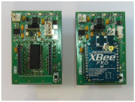 Wearable sensor node photograph: (Left) without XBee; (Right) with XBee.