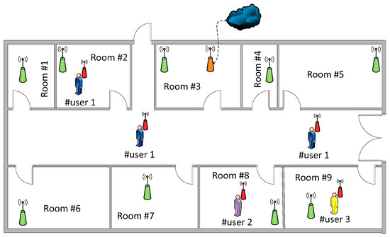 The proposed system has been tested in the indoor deployment shown in Figure 5. Each room includes a static node (green), which sends ambient parameters through multi-hop transmission to the node coordinator (orange, room #3), and then information is sent to a host device.