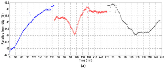 To check the correct operation of the proposed W-WSN, wearable nodes were positioned on volunteers moving along the monitored area. Figure 6 shows the measurements provided by one of the volunteers wearing a node for three consecutive days, for periods of 3.5–4.5 h. Figure 6a presents measurement results for humidity, while Figure 6b shows the CO2 concentration. CO2 peaks correspond to measurements when the user entered one of the dependencies occupied by 26 students.