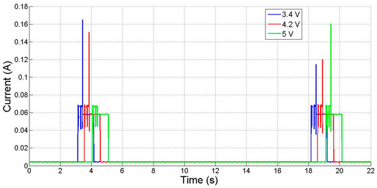 Mobile node current consumption. Nodes are biased by a nominal 3.7 V battery, charged to 5 V (green), 4.2 V (red) and 3.4 V (blue).