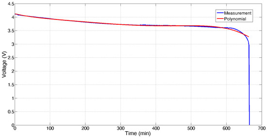 The battery discharge at constant current is shown in Figure 8: the battery voltage drastically drops after its value falls below 3.5 V. For the useful region, it is modeled according to