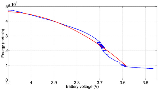 Based on the results presented in Figure 8, the relationship between the remaining energy and the voltage provided by the battery can be obtained. The result is presented in Figure 9. This behavior is approximately given by: