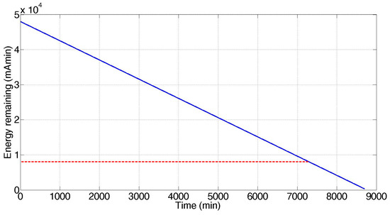 Taking into account that the useful operating voltage is limited to 3.5 V, which corresponds to a remaining energy of approximately 8000 mAmin (Figure 9), simulation results indicate a wearable node operating life of 5.07 days (Figure 10), close to the 5.34 days experimentally determined, for a duty cycle of 73.1 ms and 15 s of working cycle. These values ensure a suitable operating life for a wearable device, allowing setting down an appropriate schedule for battery recharge processes, i.e., this operability time is long enough for a portable system to be charged on a daily basis. The rechargeable system integrated in mobile sensor node is essential for this application and it is an improvement with respect to previous work.